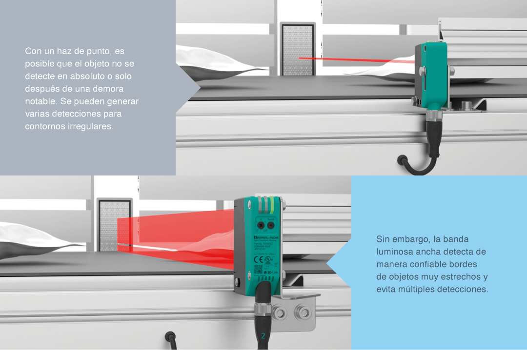 En numerosas aplicaciones, la detección precisa y fiable de objetos es esencial para un funcionamiento sin problemas. Los sensores retrorreflectantes tradicionales alcanzan sus límites, especialmente con objetos muy pequeños o estrechos que no están alineados con precisión con el área de detección puntual. Al mismo tiempo, los objetos no homogéneos con contornos irregulares también pueden activar múltiples operaciones de conmutación. Aquí es donde entra en juego el nuevo sensor de área retroreflectivo R305 de Pepperl+Fuchs. Con su amplia banda luminosa en lugar de un haz de luz puntual, también puede detectar bordes de objetos muy estrechos y solo activa un único circuito de detección de objetos para contornos interrumpidos.