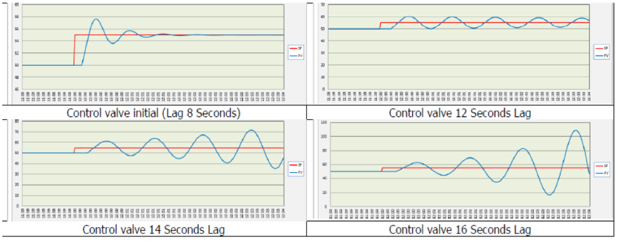 Representación de la oscilación del lazo de control debido a un mayor tiempo de retraso en la válvula de control.