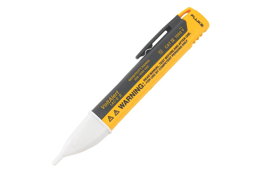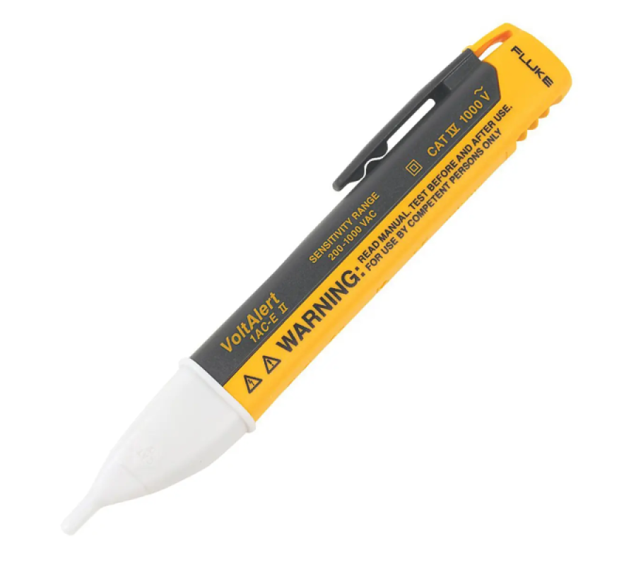 El Fluke 1AC II detecta de forma segura tensión AC en cables, tomacorrientes y conductores. Su punta luminosa se enciende en rojo al detectar voltaje, y emite una señal sonora opcional.